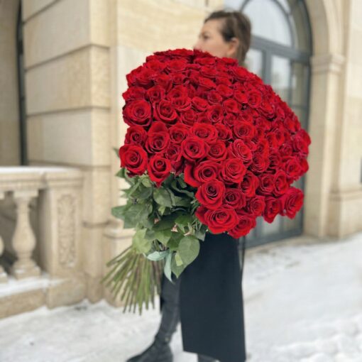 Chic bouquet of 25 red roses, 110 cm tall, in a stylish wrap(Ecuador). A complimentary flower card and a pack of cut flower food are included with each bouquet.