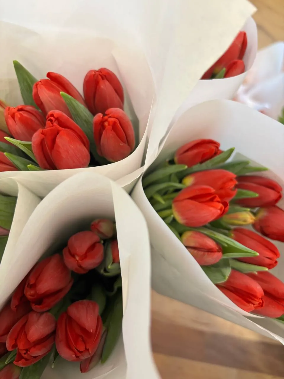 Peonies love cool conditions and plenty of water. They often arrive semi-closed and continue opening at home. To help peonies last longer, trim the stems, remove the lower leaves, and check the water level in the vase every day.
