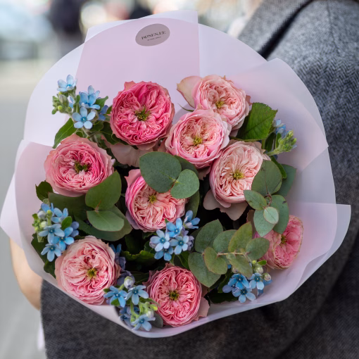 A delicate bouquet of garden roses with oxypetalum in stylish wrapping. An airy and elegant gift for any occasion.