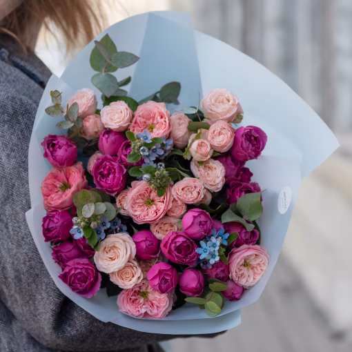 A delicate bouquet of mixed garden roses with oxypetalum and eucalyptus in stylish wrapping. An elegant and airy gift for any occasion.