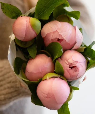 Peonies love cool conditions and plenty of water. They often arrive semi-closed and continue opening at home. To help peonies last longer, trim the stems, remove the lower leaves, and check the water level in the vase every day.