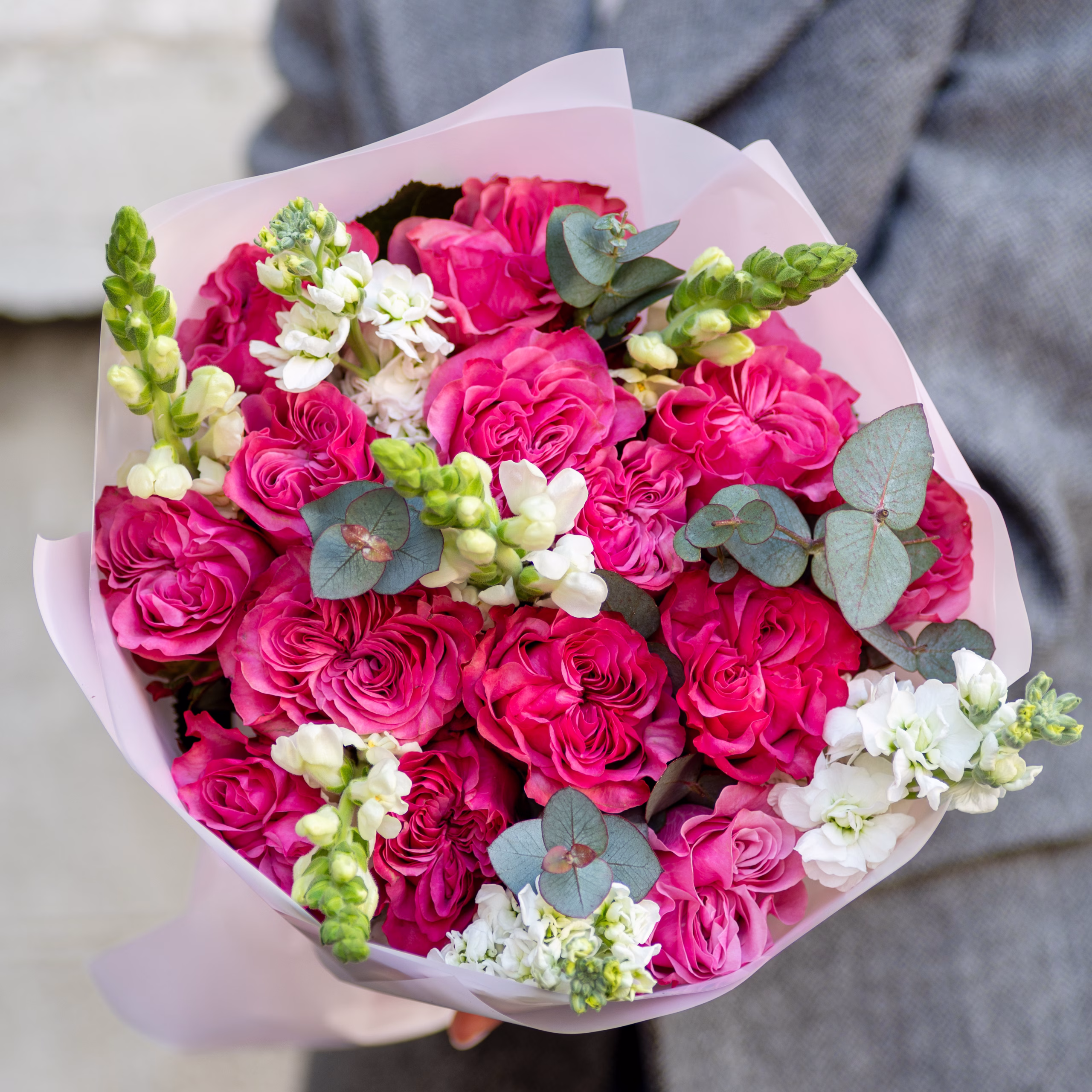 A stylish bouquet of vibrant pink roses with white flowers and eucalyptus. The contrast of tones creates a full and expressive look. Perfect for a memorable and eye-catching gift.