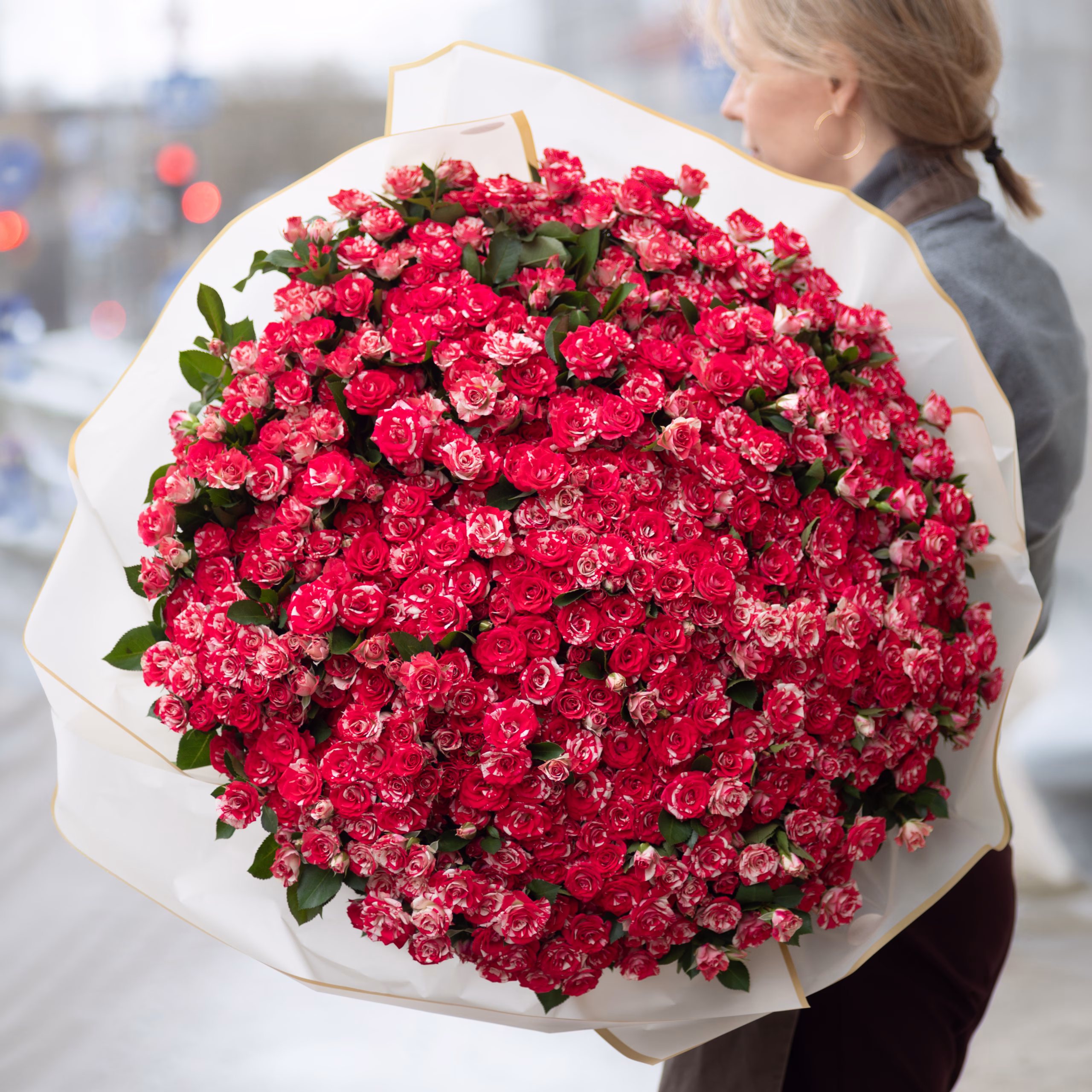 A voluminous bouquet of 101 spray roses, height 35–50 cm. Small buds and dense arrangement create a rich, round shape. The bright red color with white accents makes the bouquet especially eye-catching and festive.