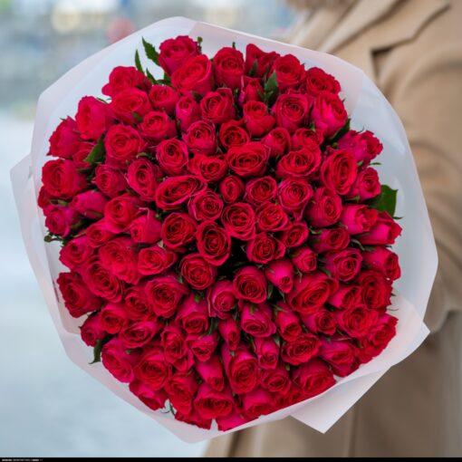 Bouquet of 101 (33) raspberry Kenyan roses, 35–50 cm in length — an impressive choice for a gift and special occasions.