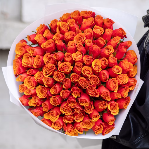 A bright classic bouquet of 101 Espana roses, height 35–50 cm. Rich orange-red color and dense buds create impressive volume and make the bouquet stand out instantly. Perfect for a strong emotional gift.