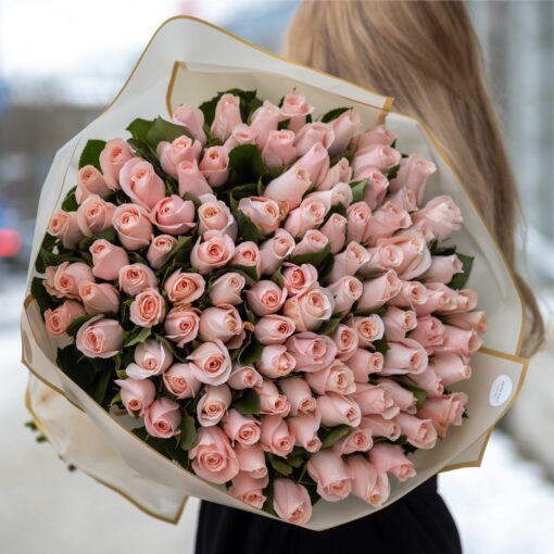 An elegant bouquet of 101 soft pink Pomarosa roses with 70 cm stems. Large blooms and clean wrapping make it a refined and impressive gift.