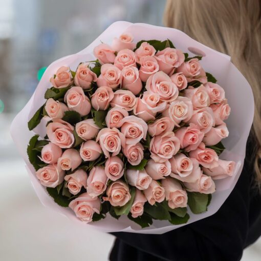 An elegant bouquet of 51 soft pink Pomarosa roses with 70 cm stems. Large blooms and clean wrapping make it a refined and impressive gift.