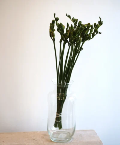 Peonies love cool conditions and plenty of water. They often arrive semi-closed and continue opening at home. To help peonies last longer, trim the stems, remove the lower leaves, and check the water level in the vase every day.