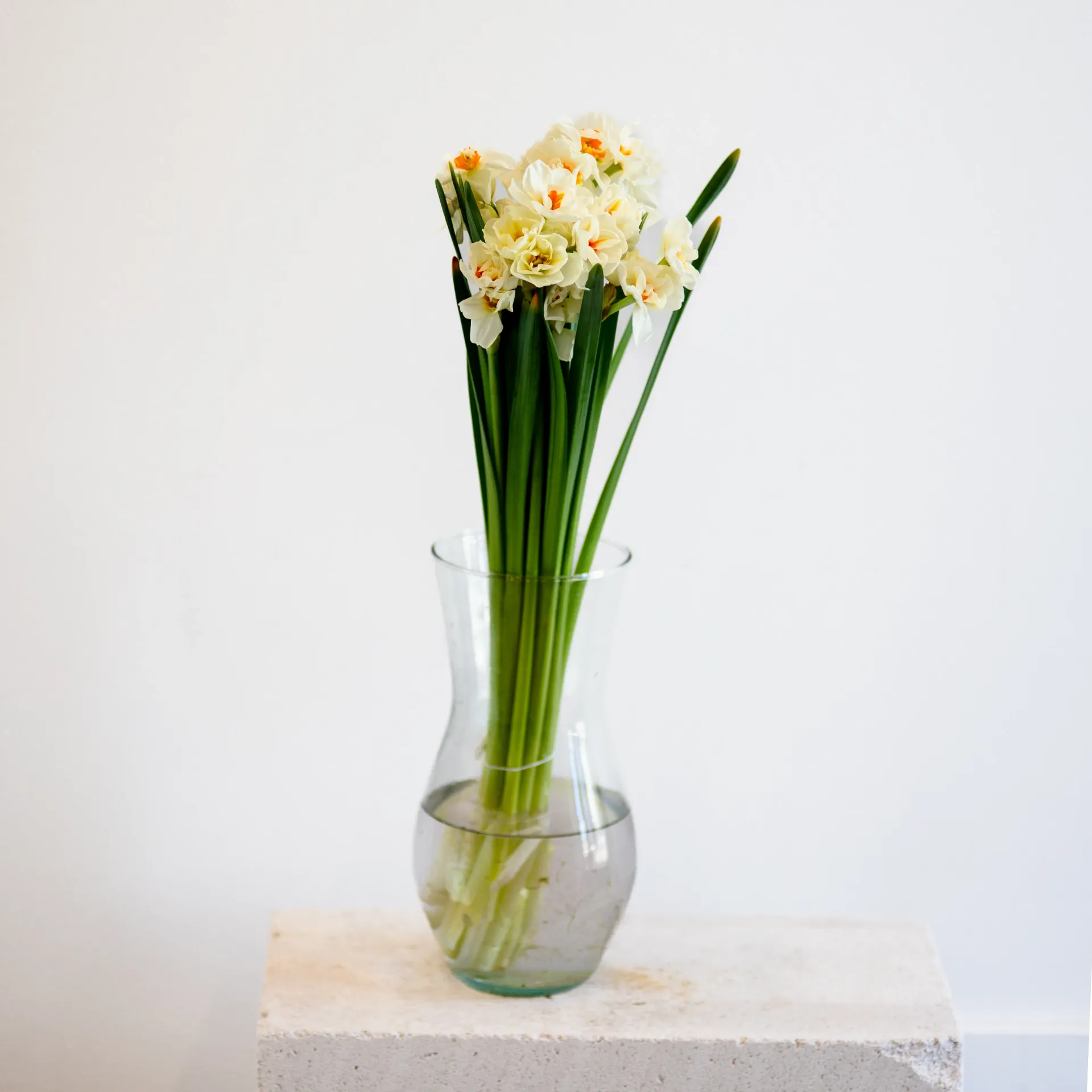 As soon as you receive the bouquet, prepare a clean vase with cool fresh water. Trim the stems by 1–2 cm, remove any leaves below the waterline, and place the flowers in the vase as quickly as possible. Change the water every 1–2 days and refresh the stem cut each time.