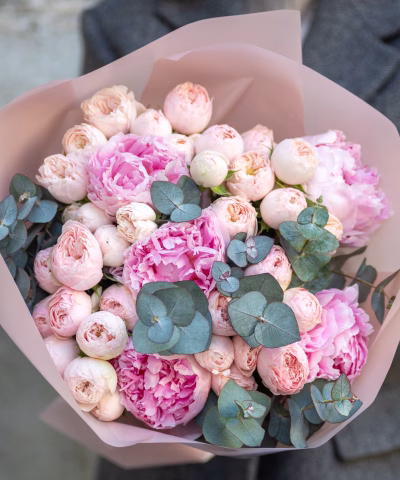 Peonies love cool conditions and plenty of water. They often arrive semi-closed and continue opening at home. To help peonies last longer, trim the stems, remove the lower leaves, and check the water level in the vase every day.