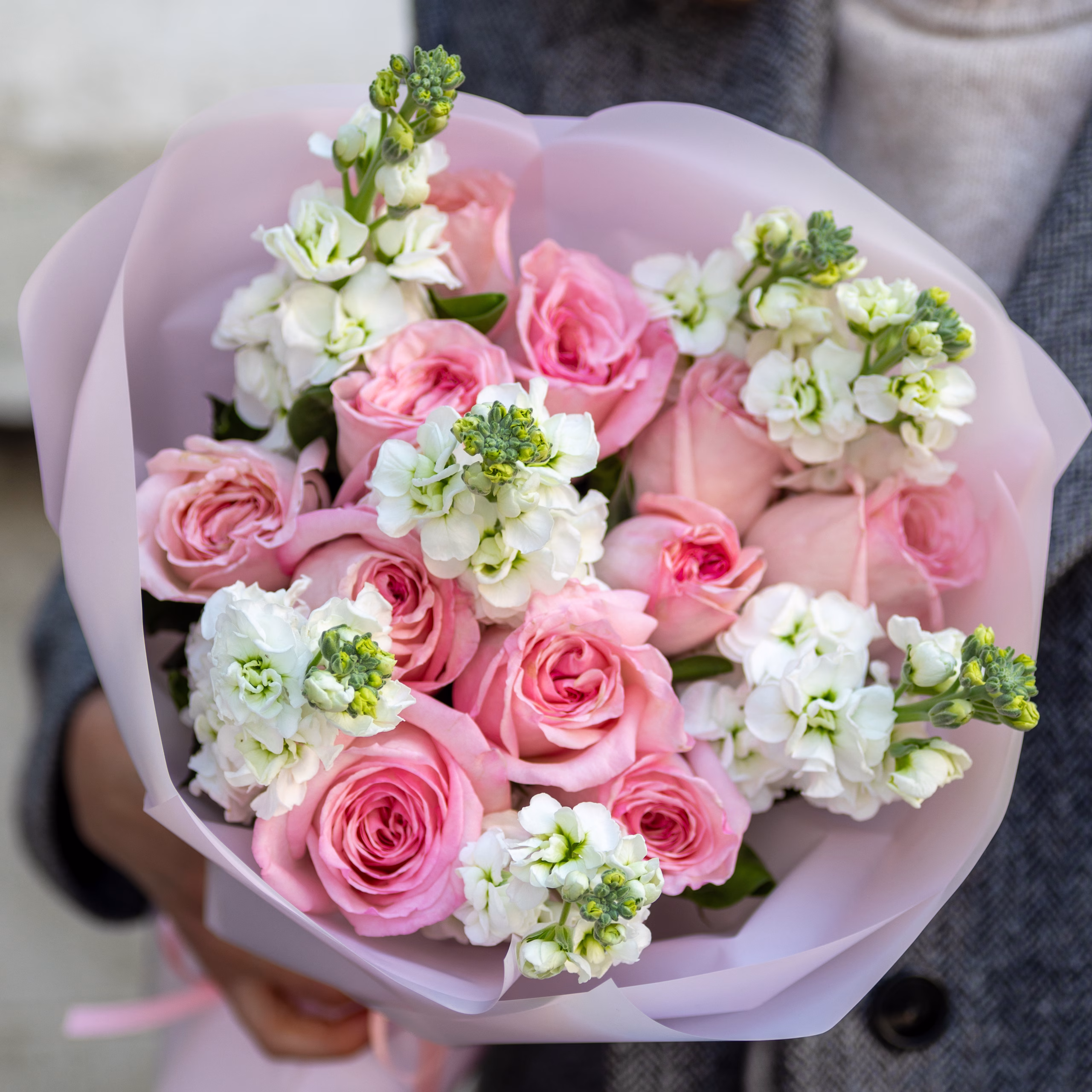An elegant bouquet of soft pink roses with white flowers. Gentle tones create a light, romantic, and refined look. Perfect for a delicate and stylish gift.