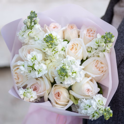 An elegant bouquet of white roses with white decorative flowers. Light shades create a fresh, delicate, and refined look. Perfect for a stylish and gentle gift.