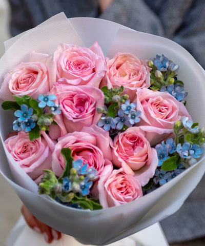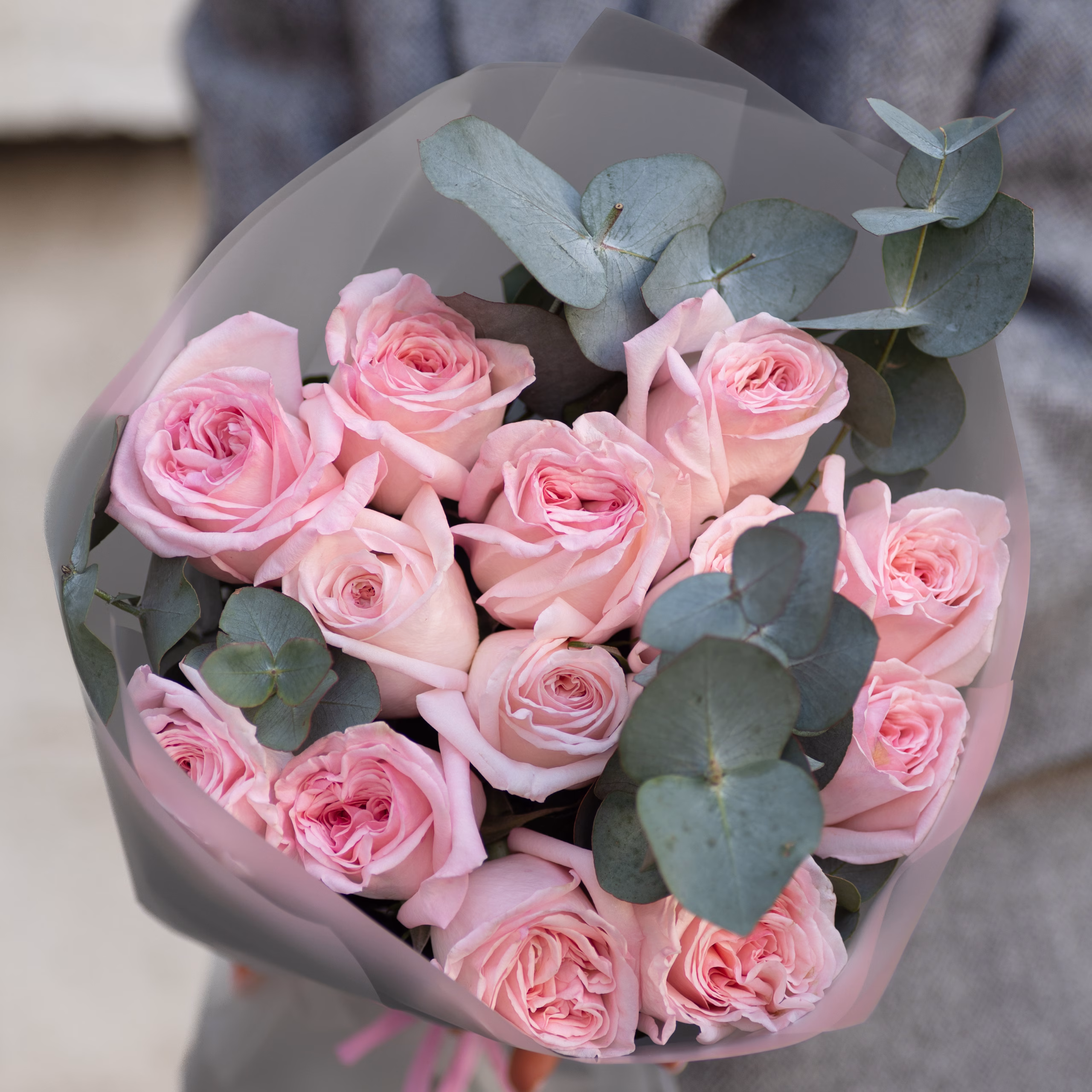 An elegant bouquet of soft pink roses with eucalyptus. Soft powdery tones and eucalyptus greenery create a stylish, light, and refined look. Perfect for a delicate and elegant gift.
