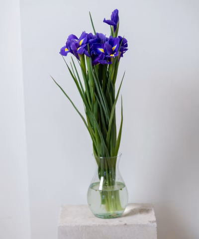 Irises are delicate and react quickly to a lack of water, so it is best to place them in a vase immediately after delivery. They open gradually and last longer in a cool place away from direct sun.