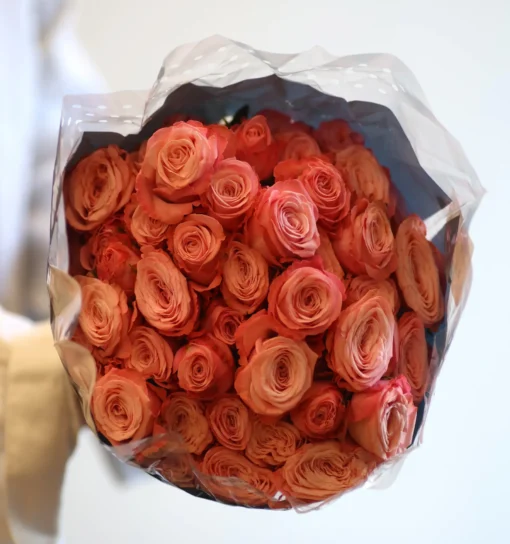 Roses prefer clean cool water and regular stem trimming. Before placing them in a vase, trim the stems, remove lower leaves, and keep the bouquet in a cool place. If the outer petals look slightly dry or darkened, they can be gently removed as they are protective guard petals.