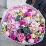 An elegant bouquet in pink and powdery shades with hydrangea, peonies, roses, and decorative flowers. The soft blend of textures and tones creates an airy, romantic, and refined look. Perfect for a stylish and special gift.