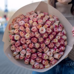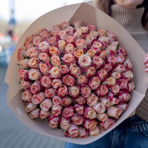Efektne kimp 101 roosist õrna värviüleminekuga. Mahukas, stiilne ja väga väljendusrikas.