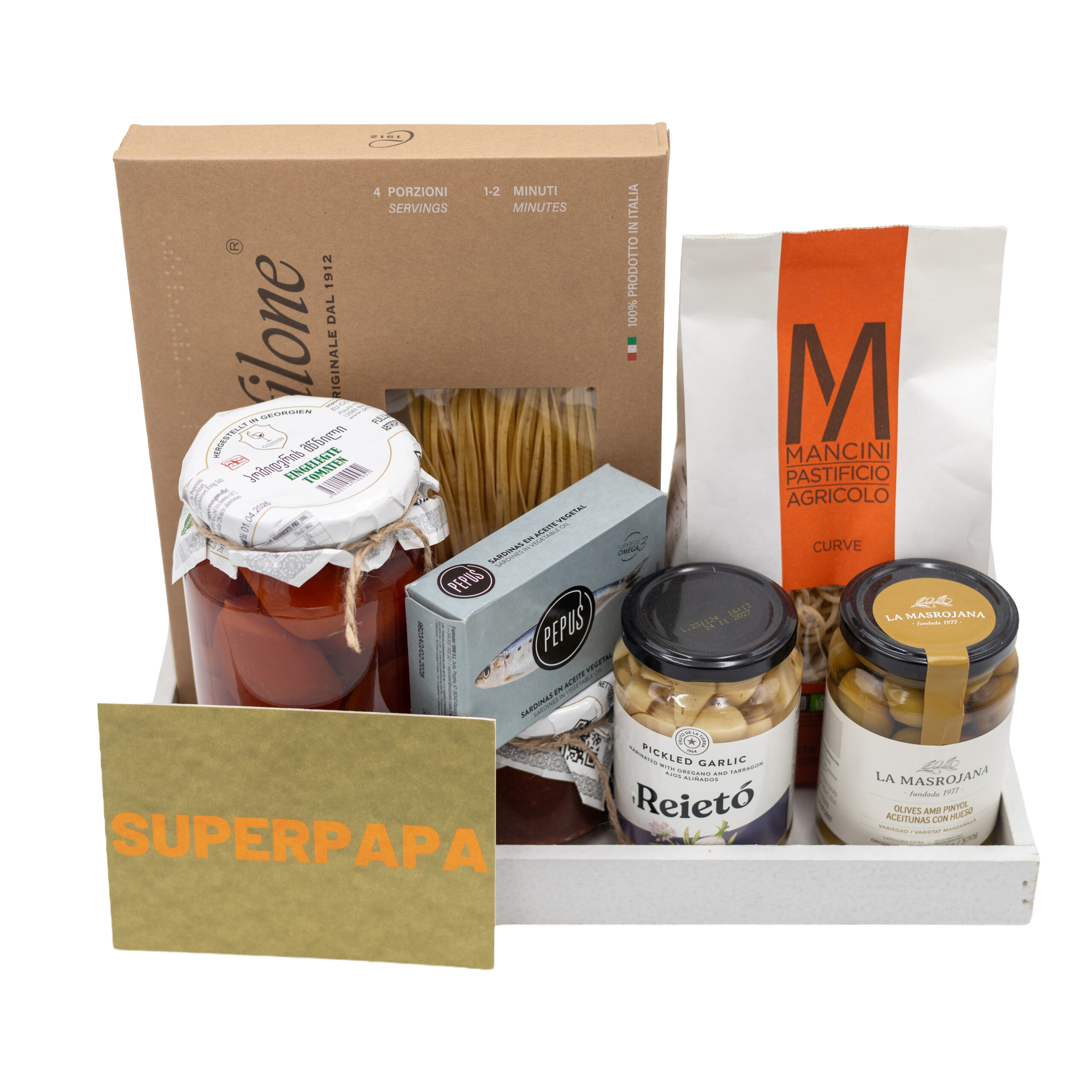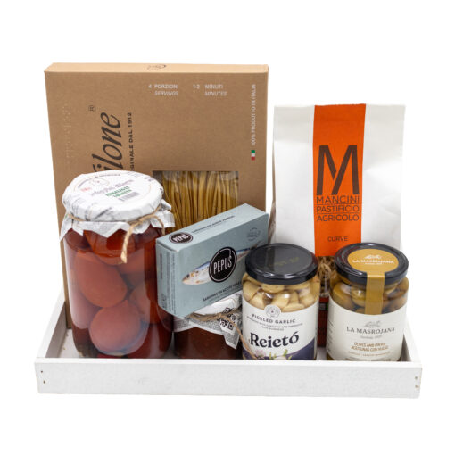 Gourmet selection includes: Marinated tomatoes 1000 g, Pepus sardines, traditional Georgian adjika sauce 220 g, marinated garlic cloves by Reietó, Manzanilla olives with pit by La Masrojana 370 g, Mancini Curve pasta 500 g, and La Campofilone Linguine with truffle 250 g. The product is packed in a beautiful transparent gift wrap — perfect as a present!