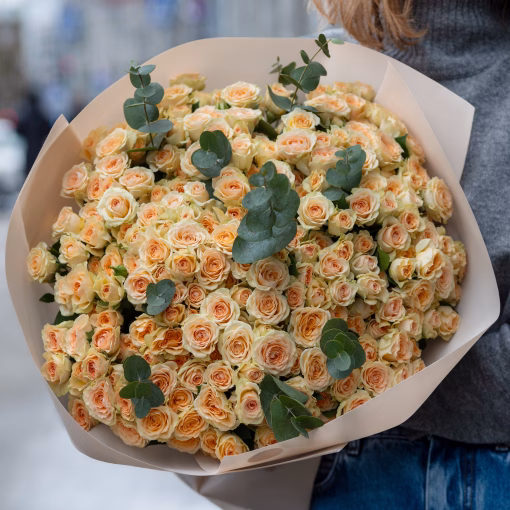Kimp 49 põõsasroosiga ja eukalüptiga — lopsakas virsikupilveke värske roheluse nootidega. Kimbu koostis võib hooajast sõltuvalt erineda.
