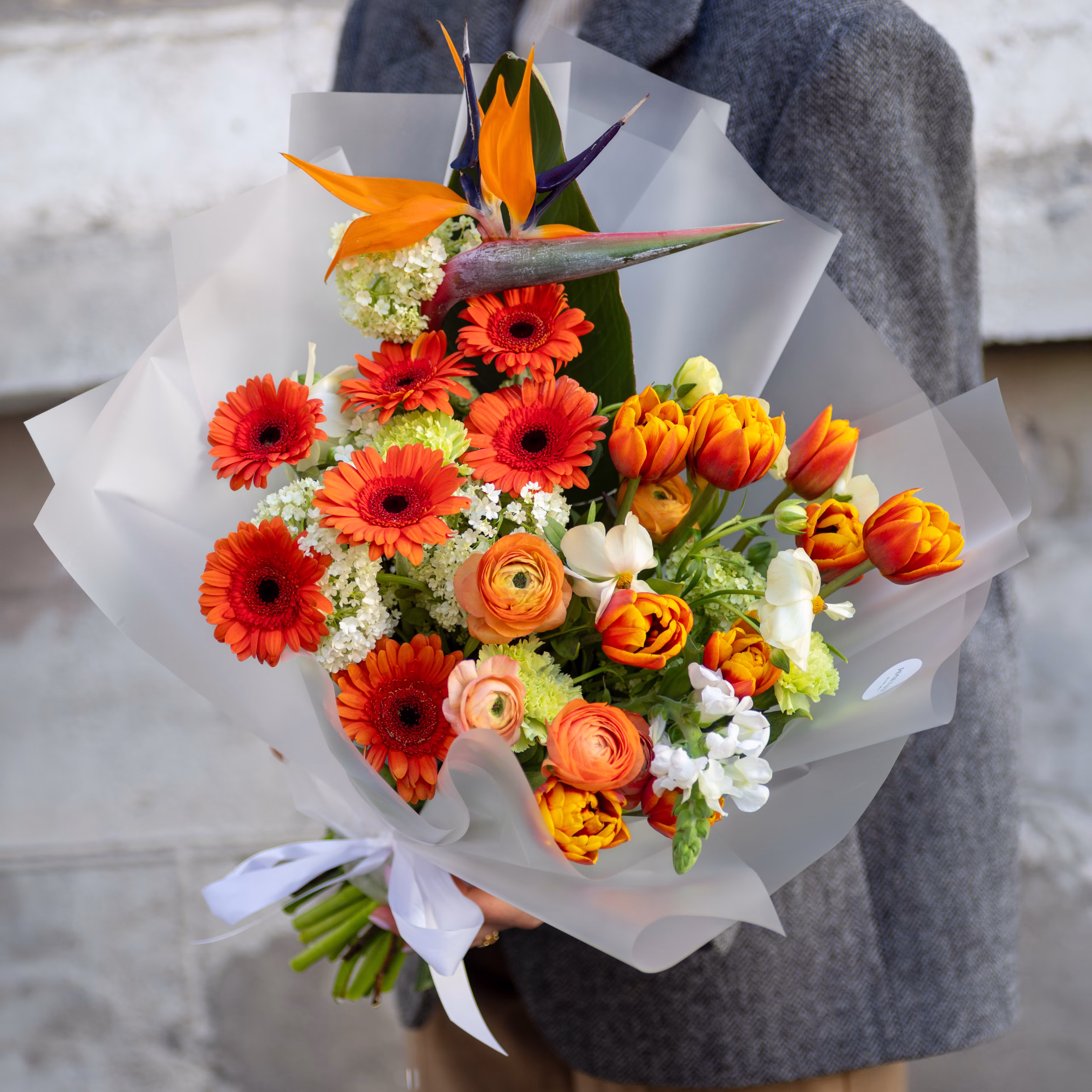 Särav kimp gerberatest, ranunculusest, tulpidest ja strelitsiast — tõeline soojuse ja värvide plahvatus. Rikkalik oranž palett teeb sellest ideaalse kingituse neile, kes armastavad elu täies säras. Kimbu koostis võib hooajast sõltuvalt erineda.