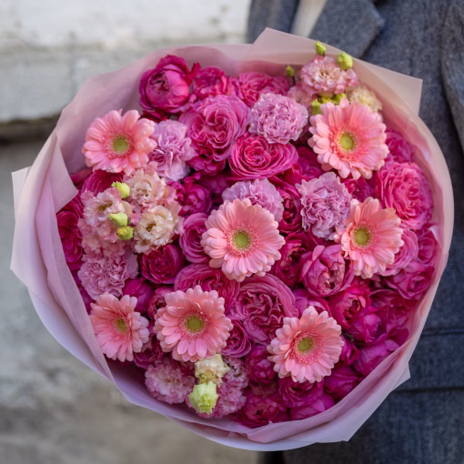 Kimp gerberast, põõsasroosist, eustoomast ja teistest lilledest — ere roosa energia ja rõõmu plahvatus. Kimbu koostis võib hooajast sõltuvalt erineda.