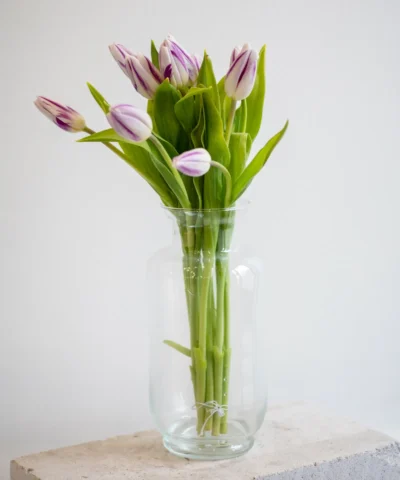 Тюльпаны продолжают расти после срезки, поэтому могут немного вытягиваться и менять направление. Это естественно. Им подходит прохладная вода и прохладное помещение. Воду лучше наливать не слишком высоко и регулярно обновлять.