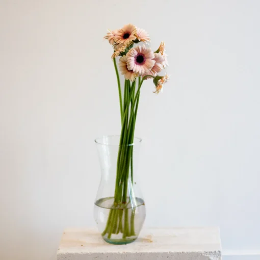 Герберы любят чистую воду, но не любят глубокую вазу с большим количеством воды. Их мягкие стебли могут быстро портиться при переувлажнении, поэтому воду лучше наливать в небольшом количестве и менять чаще обычного.