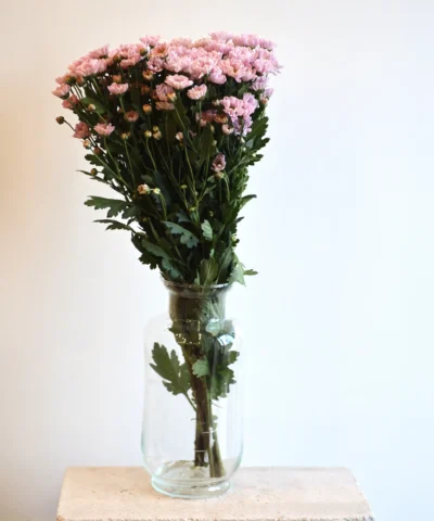 Хризантемы считаются очень стойкими цветами, но они тоже любят чистую воду и свежий срез. Перед постановкой в вазу удалите нижние листья и немного подрежьте стебли. В прохладном помещении хризантемы могут долго сохранять декоративность.