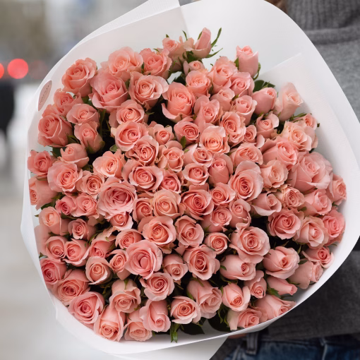 Букет из 101 (201) нежно-розовой розы — роскошный жест для особенного человека. Море персикового цвета, которое говорит само за себя.