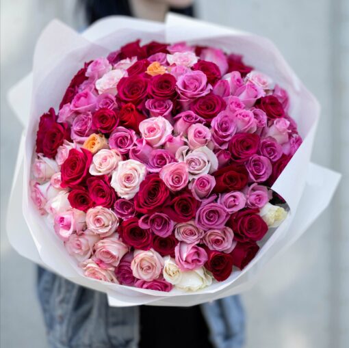 Шикарный классический букет из 101 свежих микс розы(Эквадор), высота 40-50 см. К каждому букету прикладываем открытку в подарок и средство, продлевающее жизнь розам. Рекомендуемое количество пакетиков для продления жизни букета — 4 штуки