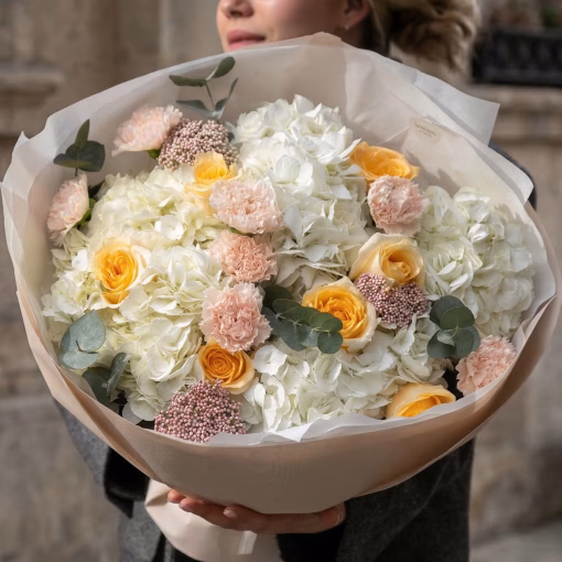 Нежный букет с гортензией и розами. Воздушный букет в светлых оттенках: пышная гортензия, кремовые розы и нежные диантусы с эвкалиптом.
