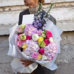 Букет из гортензии, ранункулюса, дельфиниума и других цветов — воздушное сочетание пастельных оттенков, вдохновлённое французскими садами. Состав букета может отличаться в зависимости от сезона.