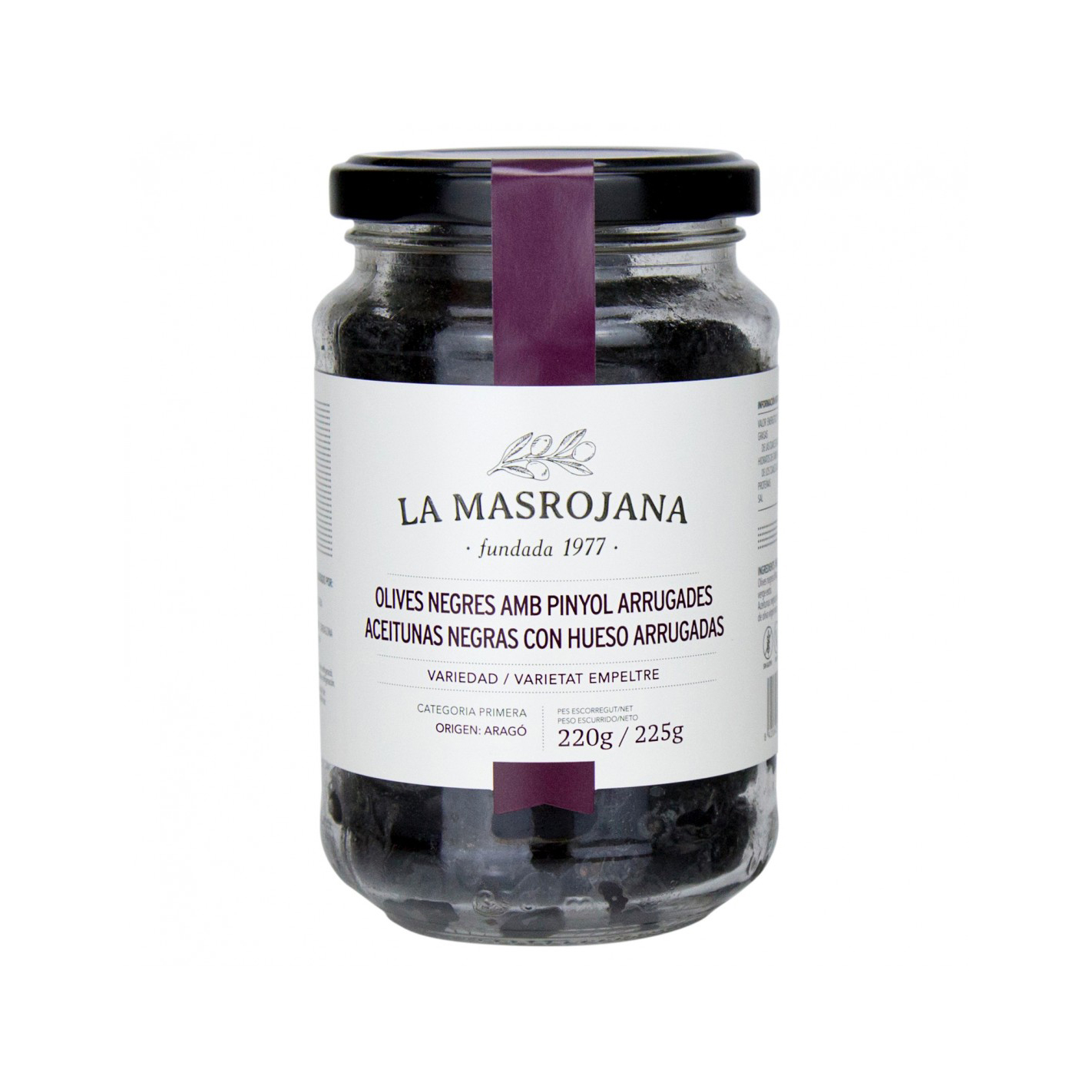 Чёрные оливки сорта Empeltre с косточкой, естественно вызревшие и приправленные только морской солью и оливковым маслом extra virgin. Благодаря своей морщинистой текстуре и насыщенному вкусу они идеально подходят для закусок и средиземноморских блюд.