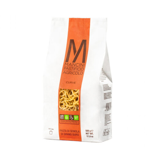 Mancini Curve pasta made from high-gluten wheat varieties offers firm texture and rich flavor. Bronze dies create a porous surface for sauce adherence, and slow drying preserves color and consistency.