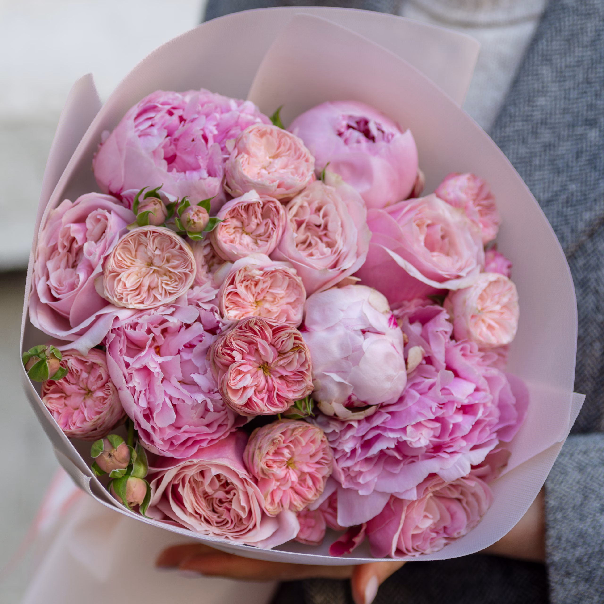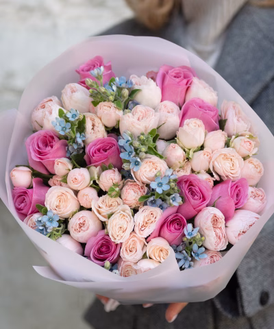 Элегантный букет с пионами и пионовидными розами в мягких пудрово-розовых оттенках. Нежное сочетание цветов создает романтичный, воздушный и утонченный образ. Подходит для стильного и особенного подарка.