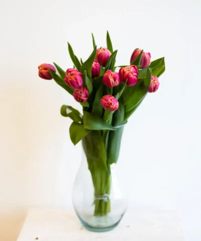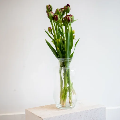 Тюльпаны продолжают расти после срезки, поэтому могут немного вытягиваться и менять направление. Это естественно. Им подходит прохладная вода и прохладное помещение. Воду лучше наливать не слишком высоко и регулярно обновлять.