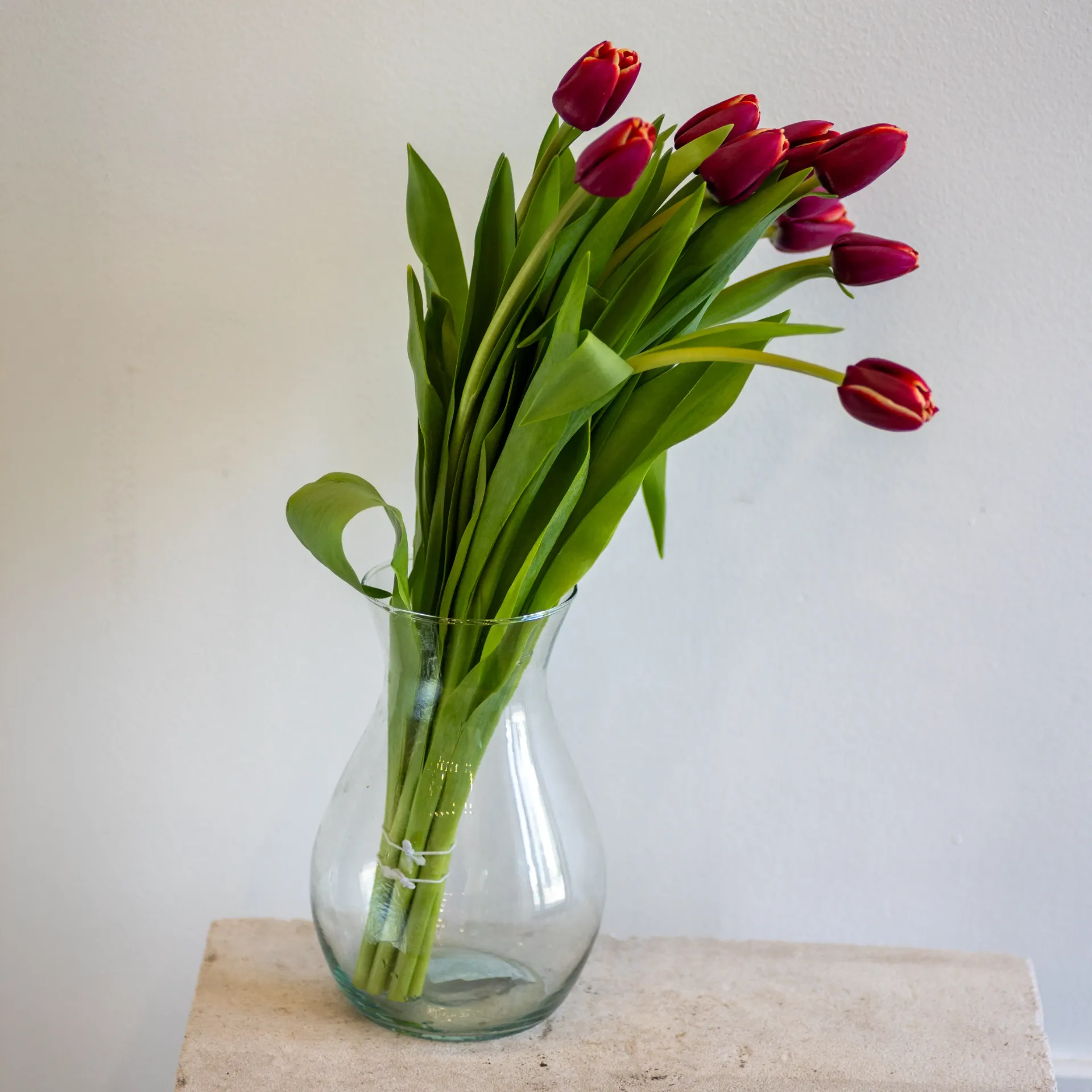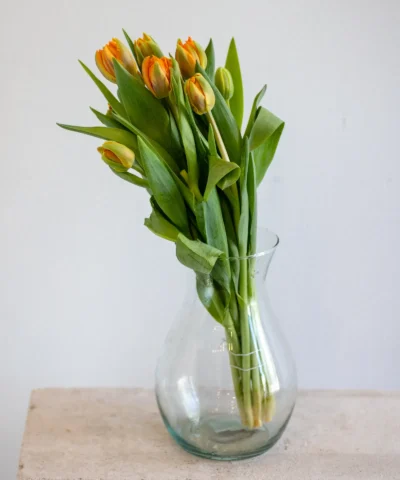 Тюльпаны продолжают расти после срезки, поэтому могут немного вытягиваться и менять направление. Это естественно. Им подходит прохладная вода и прохладное помещение. Воду лучше наливать не слишком высоко и регулярно обновлять.