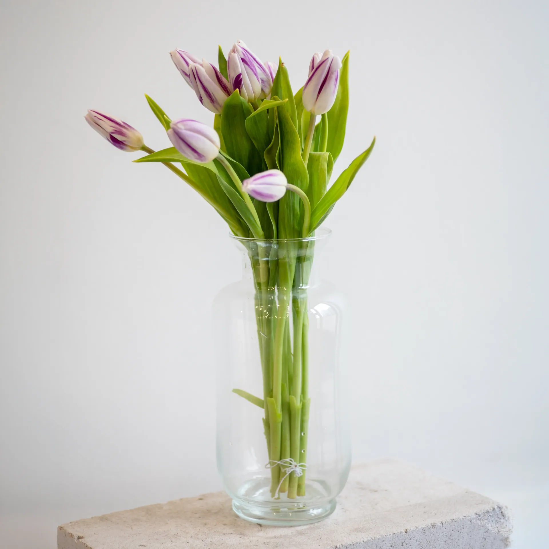 Тюльпаны продолжают расти после срезки, поэтому могут немного вытягиваться и менять направление. Это естественно. Им подходит прохладная вода и прохладное помещение. Воду лучше наливать не слишком высоко и регулярно обновлять.